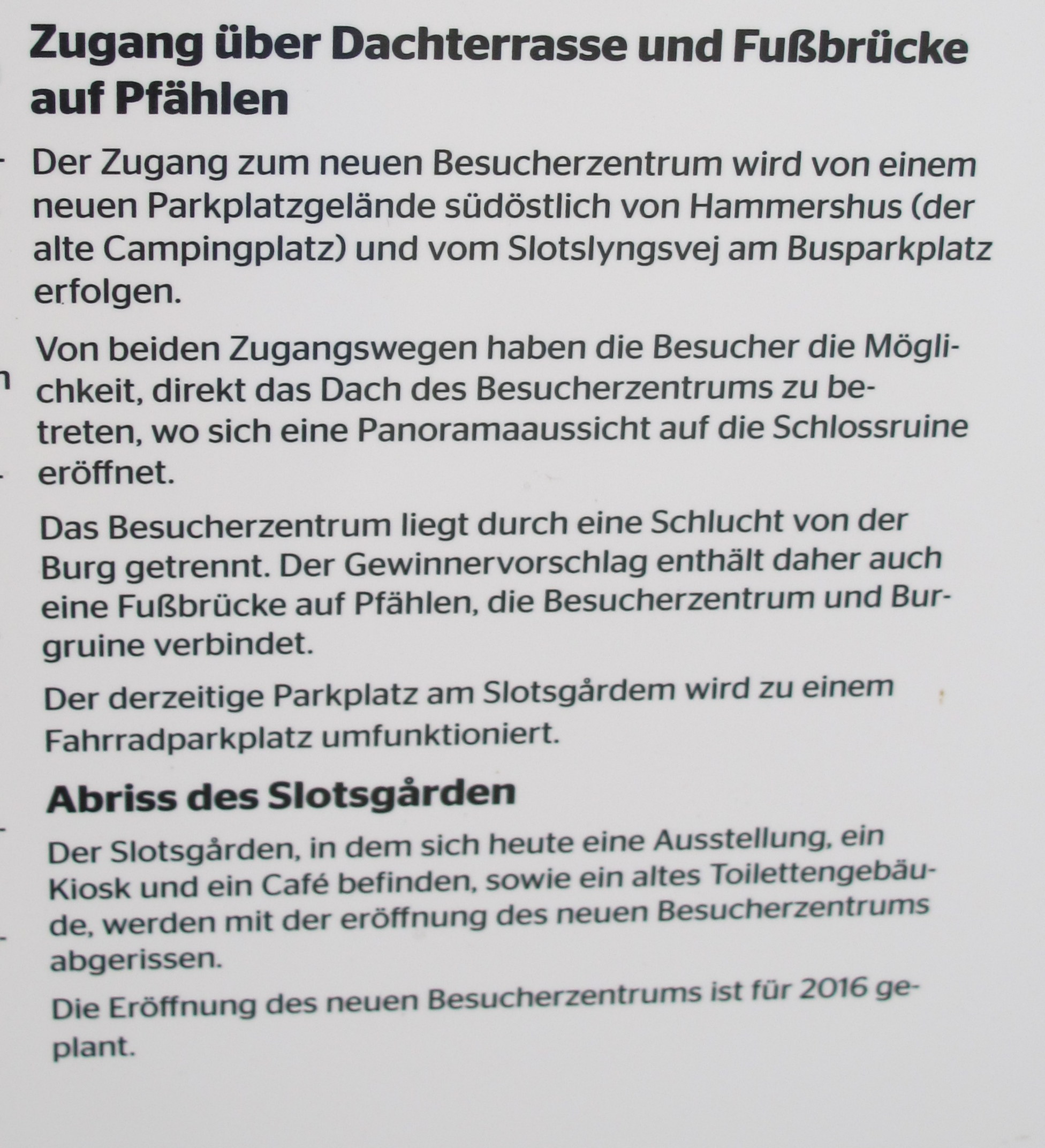 Ich war vor kurzem dort. Es sind große Baumaßnahmen zu sehen. Ein komplett neues Besucherzentrum und neue Parkplätze entstehen, aber ob das bis zum Frühjahr 2017 fertig ist? Aber wir aus dem Land von BER, Erbphilharmonie und Stuttgart 21 kennen den Unterschied zwischen voraussichtlich und wirklich fertig zu genüge. Es ist aber kein Problem, Hammershus zu erreichen. Steht man auf der Burg, und schaut zurück ins Inselinnere, sieht man sehr gut, was da an Erdbewegungen im Gange ist.