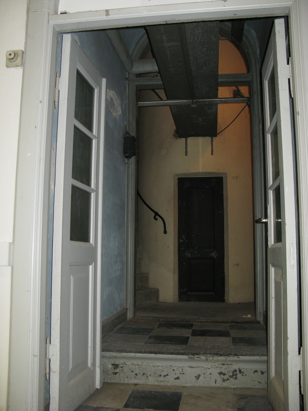 Nach oben im Turm kann man entweder den Lastenfahrstuhl nehmen oder die Treppe erklimmen. Da ich mich ein bisschen umsehen wollte, habe ich natürlich brav die Treppe genommen. Leider sind alle Türen zu den einzelnen Etagen abgeschlossen, manchmal kann man durch ein "Bullauge" in der Tür einen Blick auf die Ebene erhaschen. Viel zu sehen gibt es allerdings nicht: