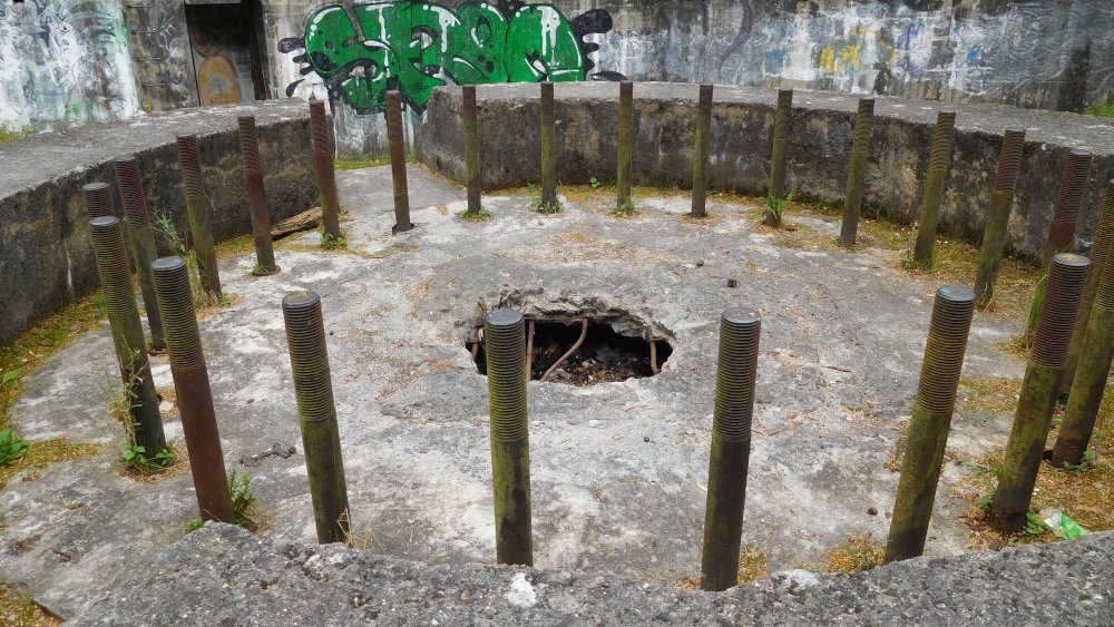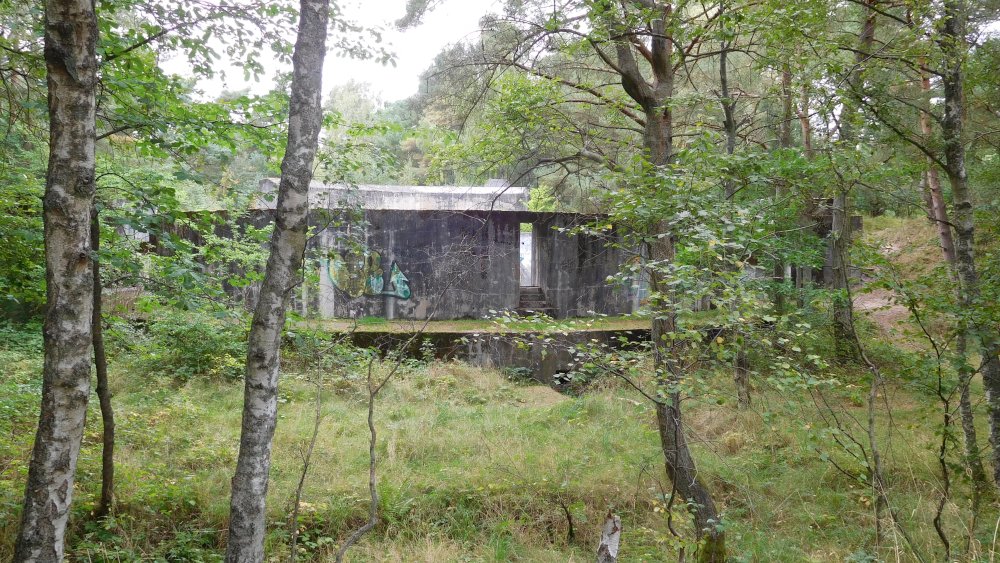 Im Wald bei Dueodde liegt die Artilleriebatterie Bornholm Süd, Dueodde. Ein gut verstecktes Überbleibsel aus dem 2. Weltkrieg. Geschütze von Schlachtschiffen (38 cm) sollten von hier aus die Ostsee beherrschen. Die Anlage wurde aber nie fertiggestellt. Geblieben ist die bunkerartige Geschützstellung. Mit den riesigen Bolzen sollte das Geschütz gehalten werden.